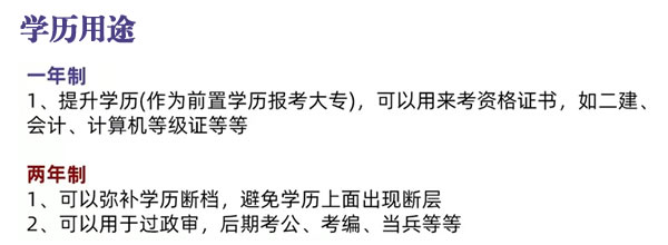電大中專的學歷用途有很多,但一年制和兩年制還是有一定區別的。如上圖所示,如果你需要考資格證書,或者作為報考成人大專的前置學歷,那么報考一年制專業就能滿足你的需求。但如果你沒有高中學歷,報中專為解決和避免學歷斷層,那么就需要報考兩年制專業了。包括考公、考編、當兵入伍亦是如此。