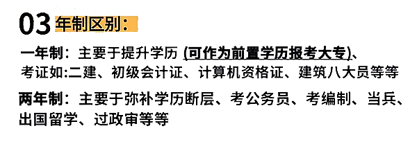 年制的區別,也就是用途的區別,選擇報考年制主要看自己考學歷的用途,其次看自己實際的學歷條件,因為電大中專注冊是不需要審核證書原件的,所以你會看到有的人告訴你初中也能報一年制,有的人卻建議你初中不要報一年制。
