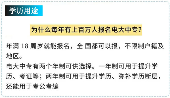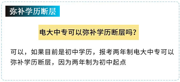 如果你出現(xiàn)學(xué)歷斷層,或者不想自己出現(xiàn)學(xué)歷斷層,那么都可以選擇報考兩年制的電大中專學(xué)歷,初中起點報兩年,完全符合招生簡章要求。這樣以后政審用途都不會有影響。