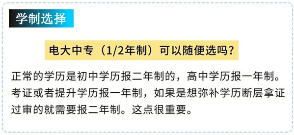 很多同學(xué)不知道該如何選擇學(xué)制,實際上不用考慮其他因素,主要看自己用途選擇即可,一般來說報考電大中專的多數(shù)都是初中學(xué)歷,如果年齡較小以后有考公、考編、當(dāng)兵入伍、,涉及政審打算的,或想進國企的,那就不用考慮直接選兩年制專業(yè),因為一年制是無法通過審核的。如果年齡比較大了,或者明確以后不會有上述涉及政審方向的用途,那就不用考慮學(xué)歷是否斷層,直接選擇一年制即可,下證更快、費用更低。另外如果你就是為了考取資格證書使用、報考成人大專學(xué)歷使用,那么也是直接報考一年制就行。